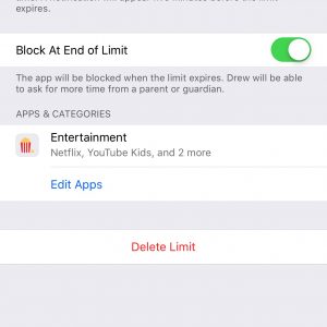 App Limits are based on categories defined by Apple. Within the categories you define time limits and whether to block usage after the allotted time. A user can request additional time from within the application once the limit is reached. Extensions can be granted from Organizer’s phone or tablet, remotely, or directly on the child’s device, locally, for 15 minutes, an hour or for the rest of the day.